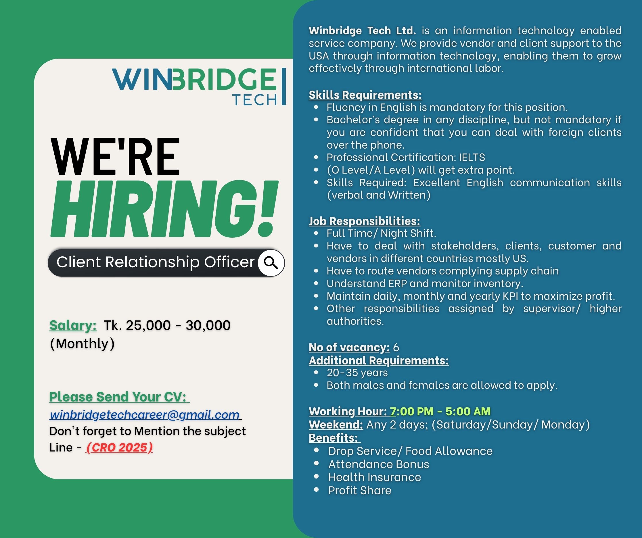 Winbridge Tech Ltd. is an information technology enabled service company. We provide vendor and client support to the USA, UK, Canada, Australia through information technology, enabling them to grow effectively through international labor.ech Ltd. is an information technology enabled service company. We provide vendor and client support to the USA, UK, Canada, Australia through information technology, enabling them to grow effectively through international labor.